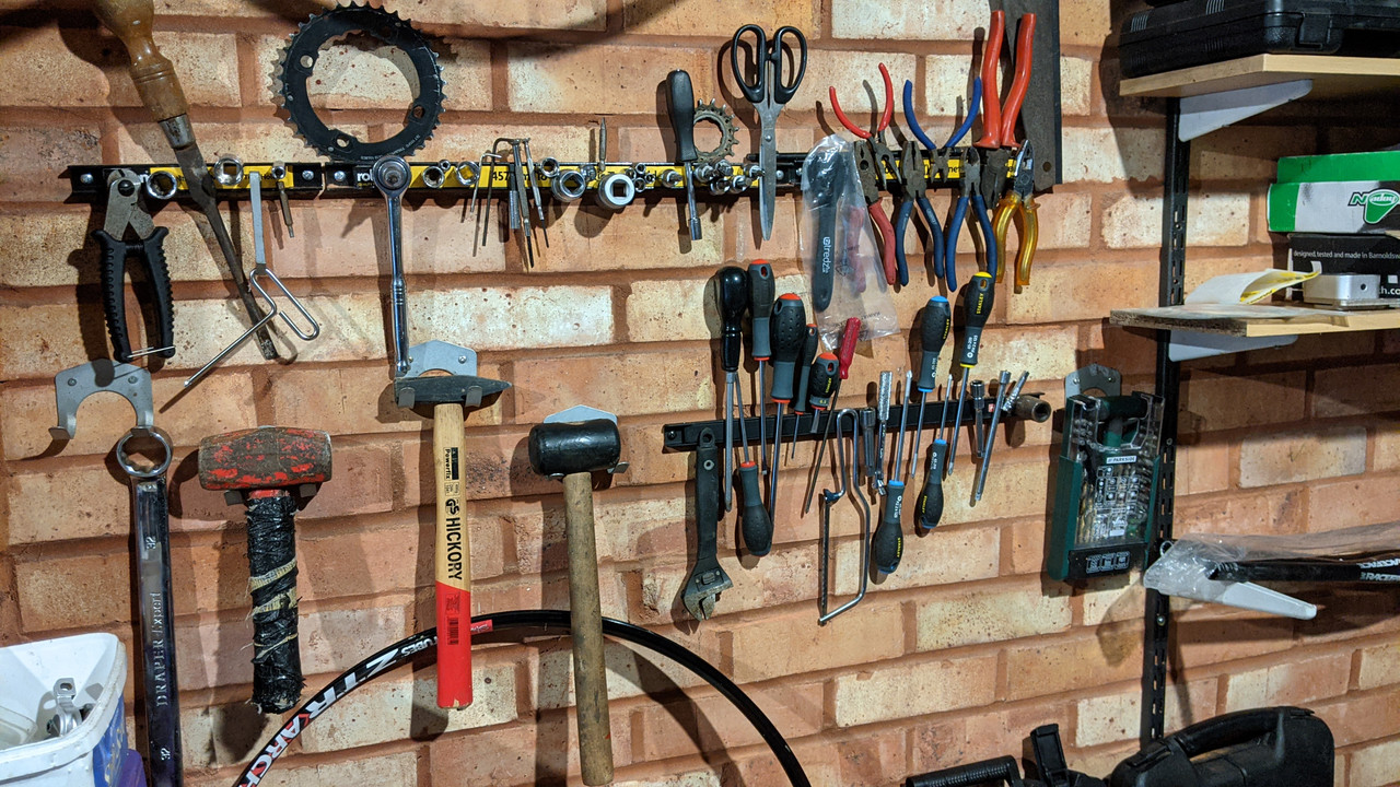 I bought a couple of cheap magnetic knife holders from Ebay and screwed them onto the osb wall. It's enough to hold most of my smaller bike specific stuff like cassette tools, spoke wrenches, chain whips, allen keys etc.