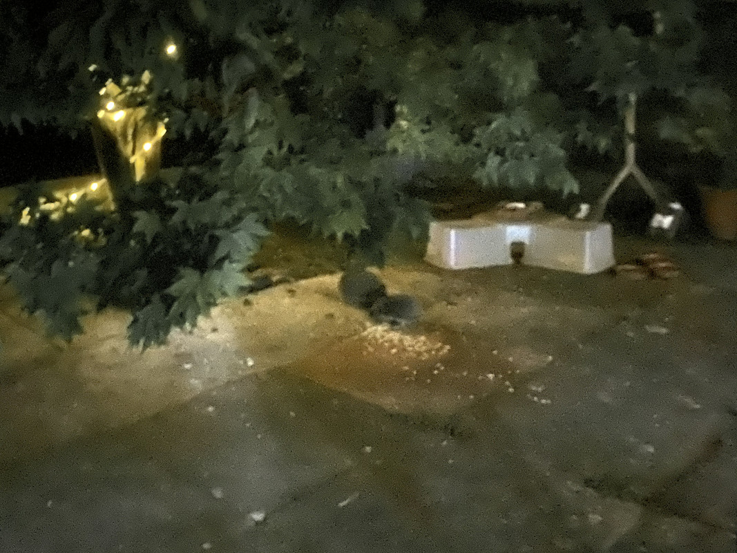 This is a pic I took a few days ago at around ten at night, there’s a couple of ‘hogs, one of the large adults, and one of last year’s smaller brood. We’ve had six around of an evening before, the three boxes I’ve fixed up as feeders can have three ‘hogs in at once, and I’ve seen one polish off a plate full, then barge into the next box, trying to climb over the ‘hog eating in there!