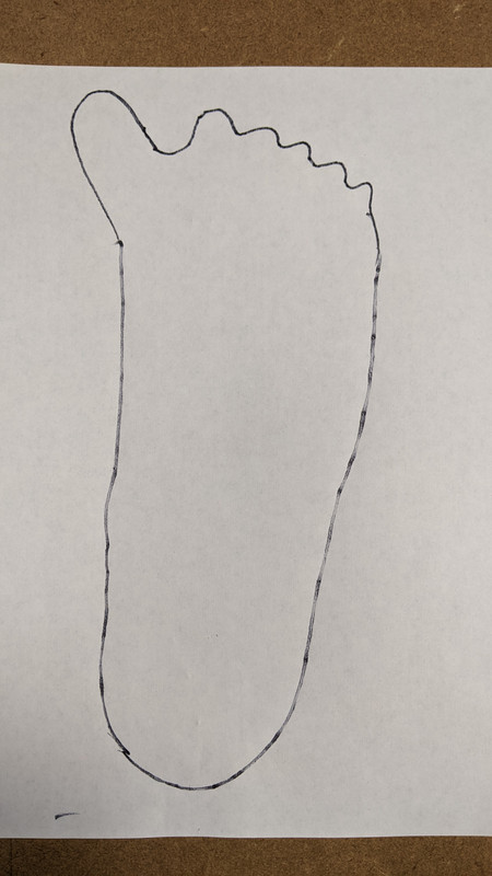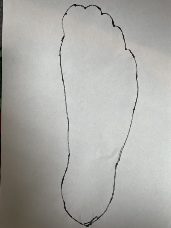 Place bare foot on paper keep pen vertical and draw around foot if you can please!