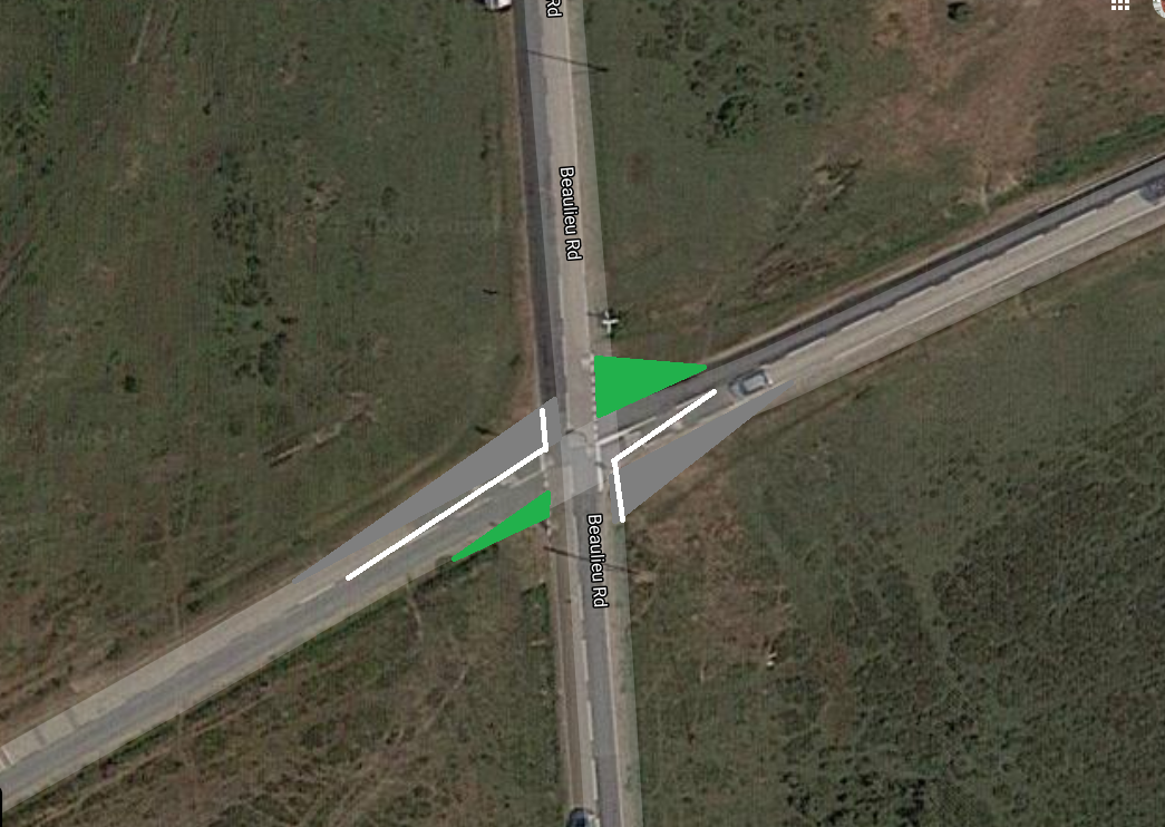 My idea was to introduce a minimal offset across the junction with minimal environmental impact by shifting each of the smaller roads one metre left as the approach the junction. No major re-routing required