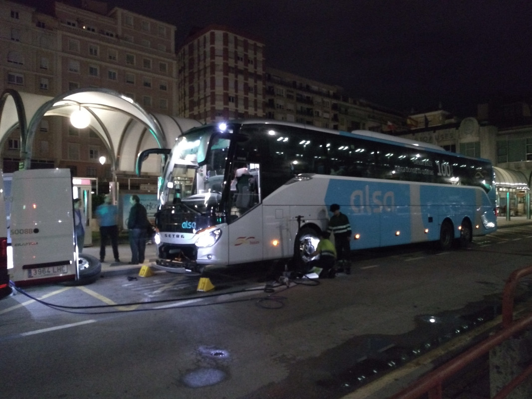 Getting around in Spain means busses to us, often at night with regular stops in bus stations. Here a pit stop for a tyre change