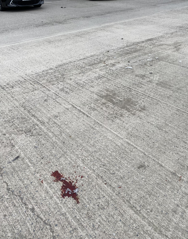 Just to the right, there’s more feathers, and across the way, between two cars, this: