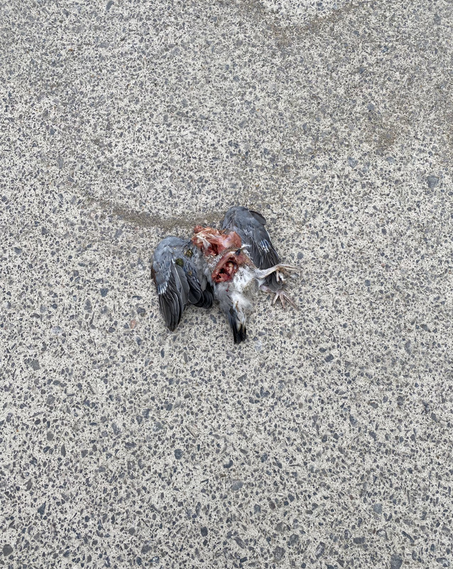 That happened while I was at lunch, and clearly the peregrine, and there were a pair regularly flying around, had taken the crunchy bit with the soft centre, before leaving the rest for later. I left the corpse where it was, and the next day, it had gone.