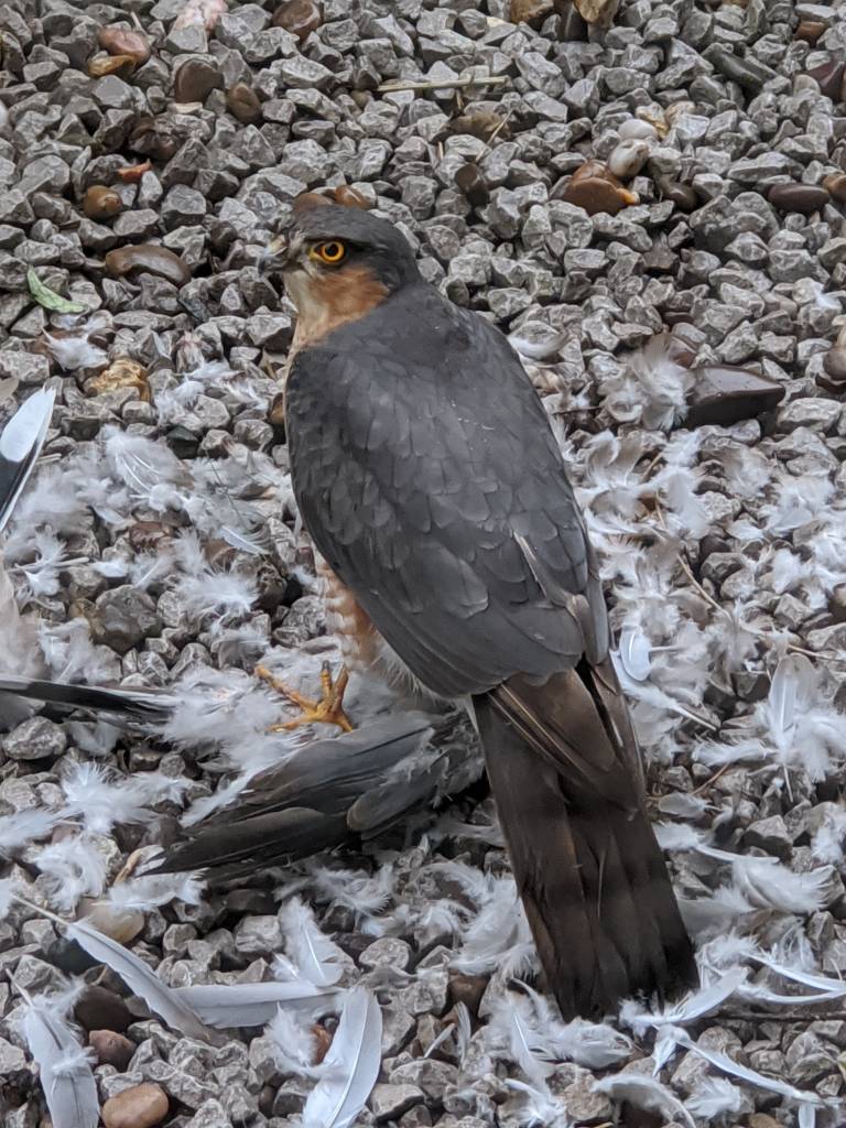 last year i was doing my first ride of the year on my road bike and was cycling down a country lane. i saw a sparrowhawk on the side of the road having caught a pigeon. i recognized it by its long legs like a kestrel on stilts. anyhoo i kept cycling as i didn't want to scare it away. was chuffed to bits to see one as it was my first sighting of one 🙂