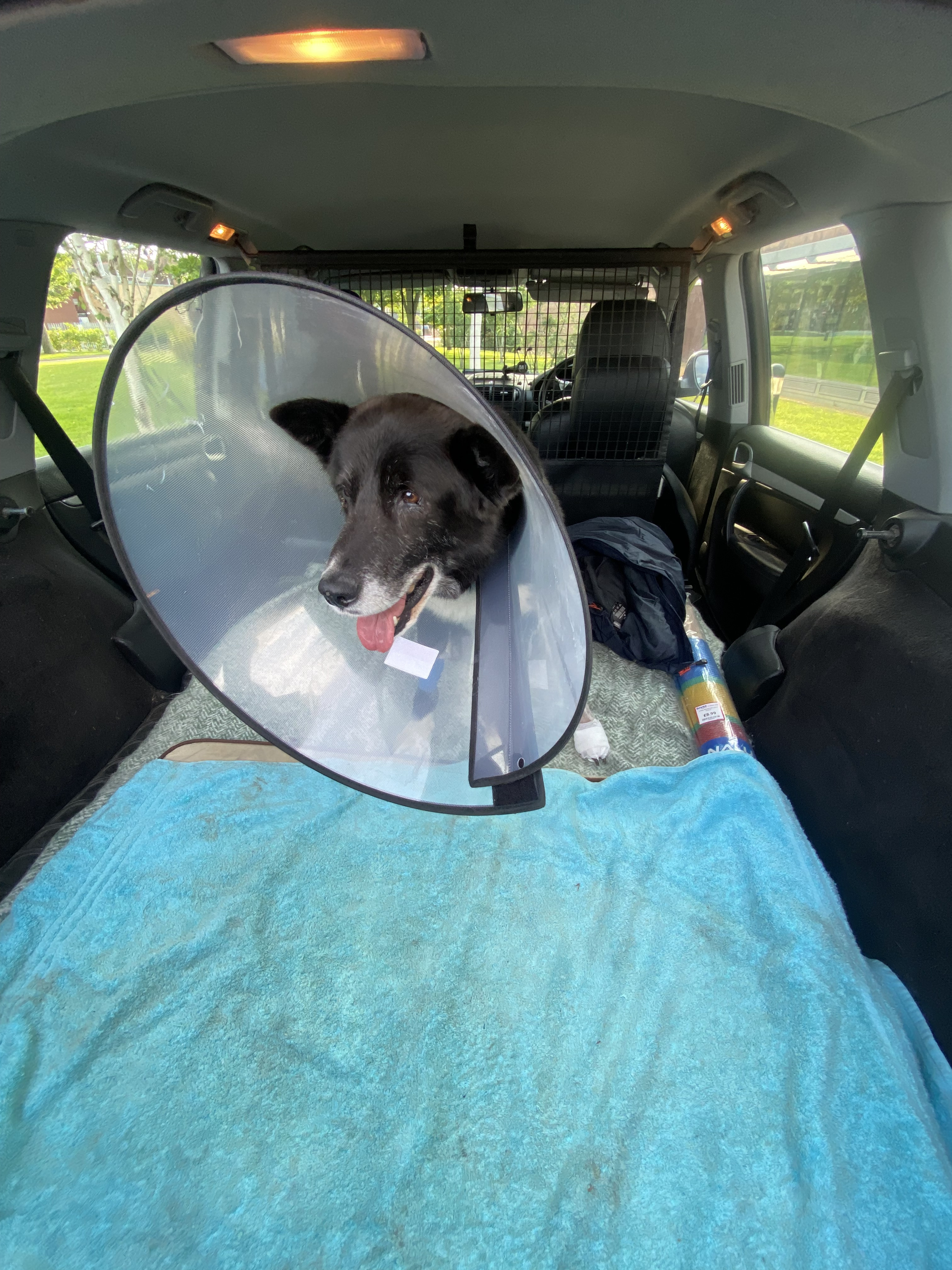 He was only smiling because he was happy to be out of hospital and on the way home - NOT HAPPY at all to be wearing the cone of shame!
