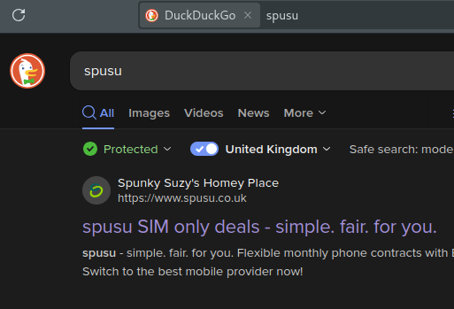 DDG shows the title of spusu.co.uk as Spunky Suzy's Homey Place 🤣🤣Â