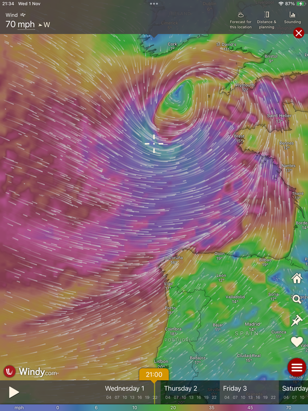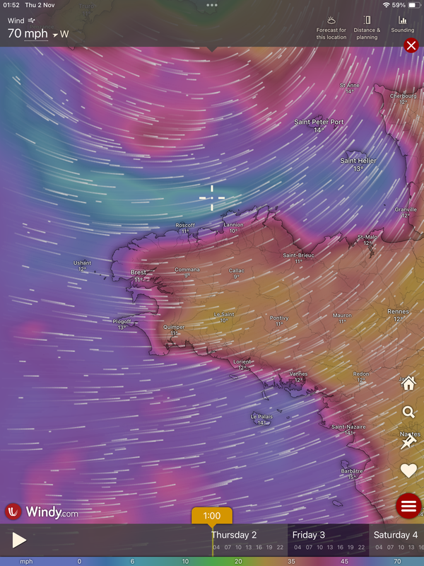 According to Windy.com, it’s hitting 49-50 mph between the Channel Islands and Portland Bill at the moment. I can hear it starting to gust a bit around my chimney, or at least where it used to be.