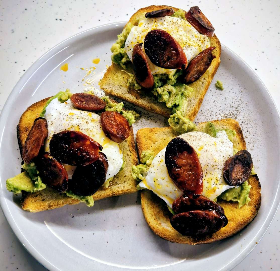 Toasted soda bread well buttered, smashed avocado, poached egg, fried chorizo