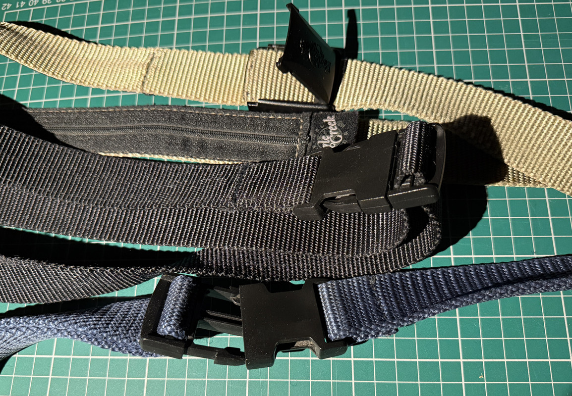 Here’s three of mine, the top green one has the original buckle, the next down, the black one, the folding part of the buckle snapped, so I cut the stitching you can see on the left of the green belt and re-stitched it with the snap buckle, and the blue belt, which is very thick, had a metal ‘military’ style buckle, it’s a skate belt, but the buckle rattled and was annoying, so I just stitched a snap buckle on. Practically indestructible, unless you stand on the buckle and break it, in which case you just restitch a new buckle on.