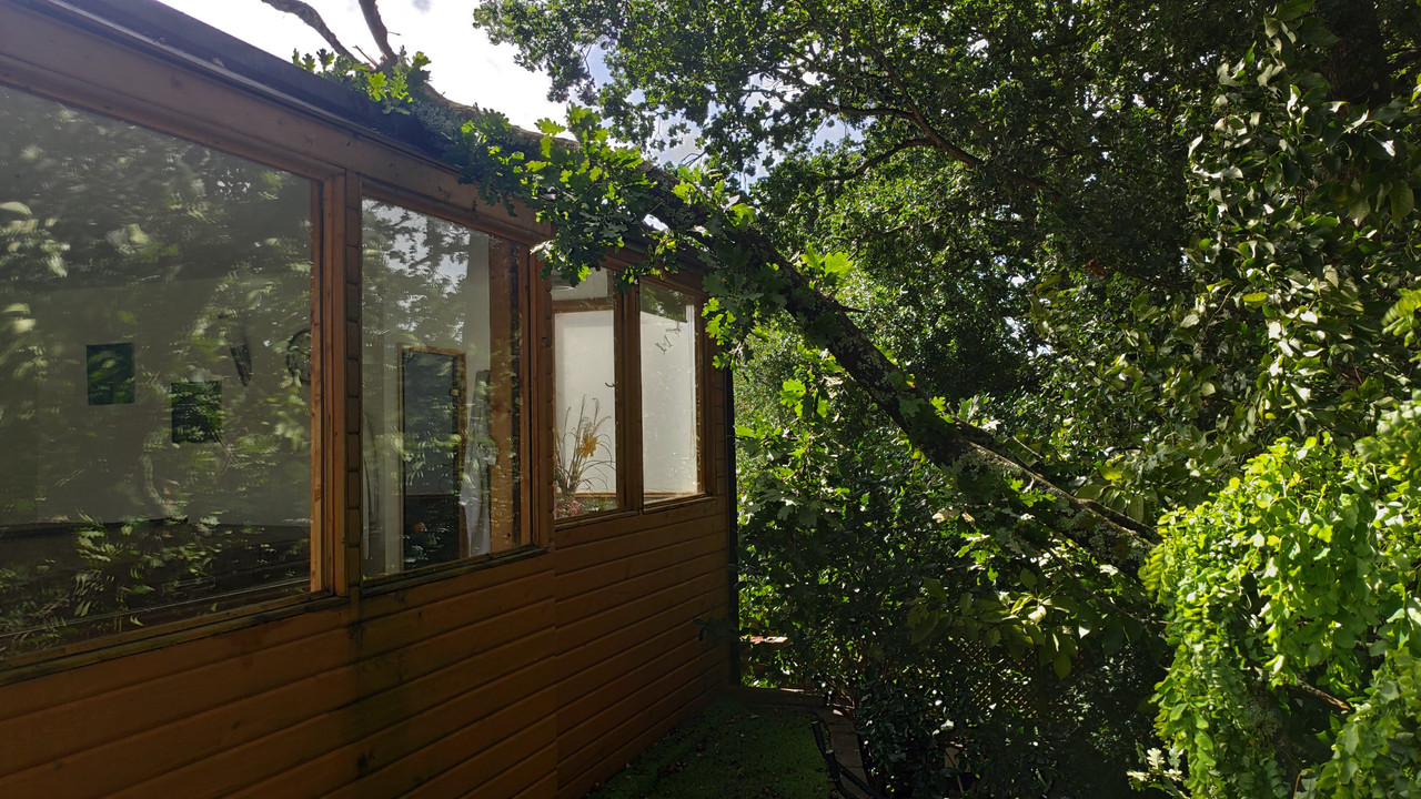 I have just looked out the window and noticed a large branch has dropped about 40 feet or so onto the cabin roof. The top half of the cabin walls are all glass panels with a few wooden uprights to support the roof.