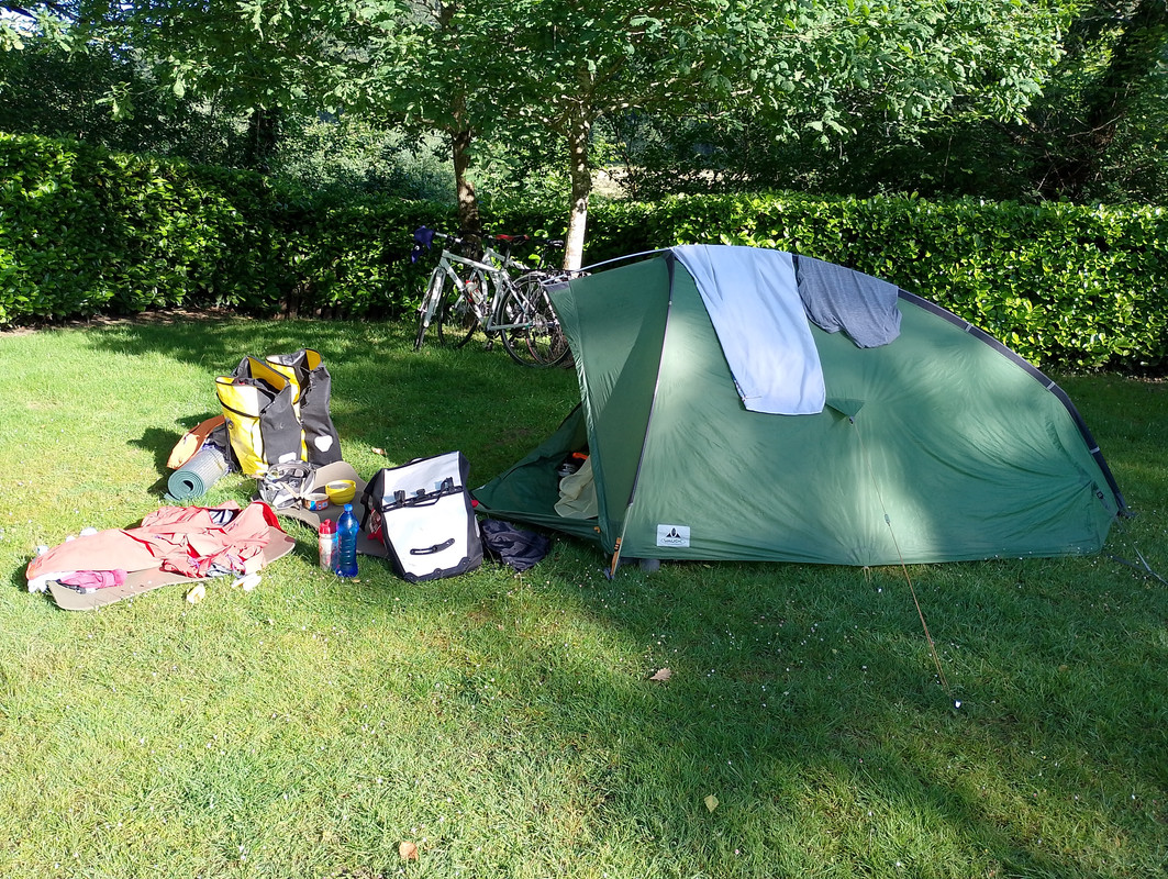 After 20km there was pshhh from Madame's machine, the barely worn tyre had defomed and worn through the bulge. A patch and piece of old tubular got us under way again to Leclerc sport in Oloron by which time the tyre had another bulge and wouldn't have gone much further. A new made in France Hutchinson fitted we continued to the fine campsite in Aramits.