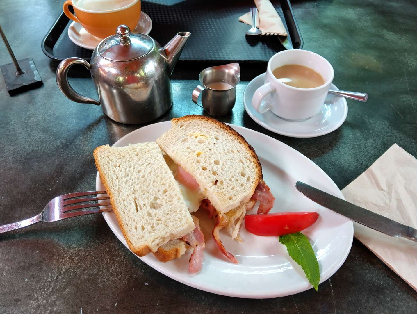 I'm not a particularly OCD type person but that image has me twitching. A bacon sarnie eaten with knife and fork? Wtf is the garnish? It's cheap, sliced bread, the provider has deemed that a mug isn't the preferred choice, but a teapot and cup and saucer*. Cafe trying to be posh and failing completely. 🤣 Don't forget to stick the pinkie out....