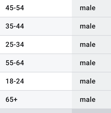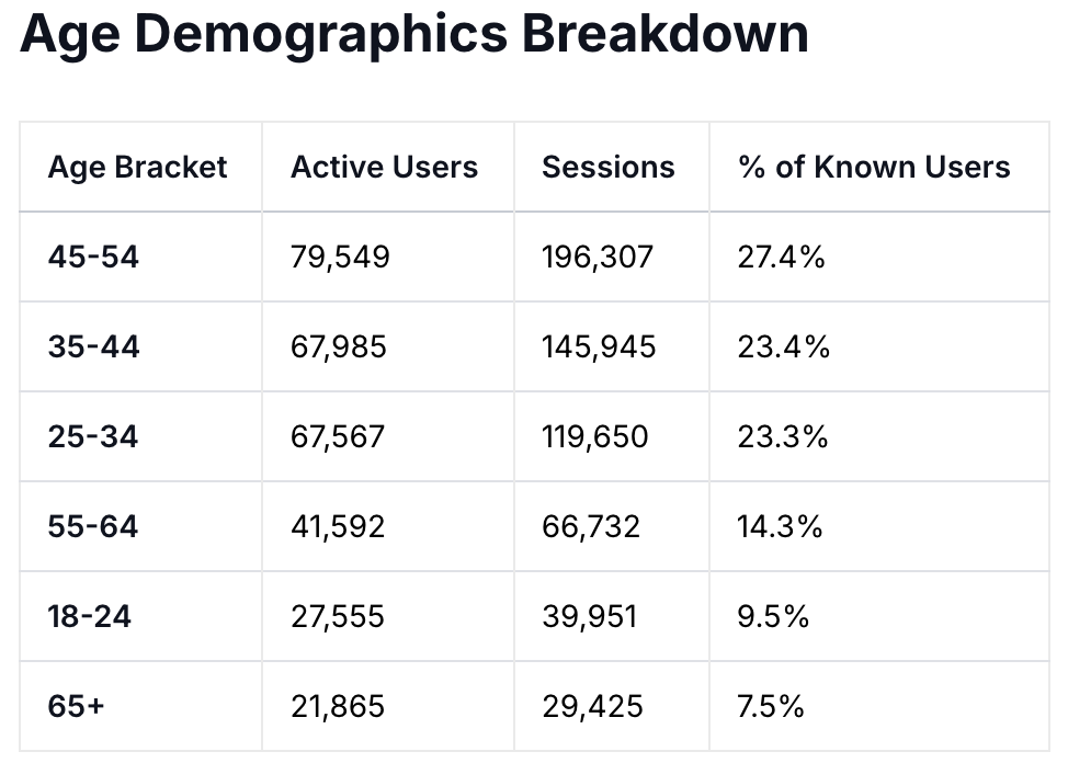 Age demographic for the last month in ranking order. Date from Google Analytics and based on a sample size of around 27% of all users.