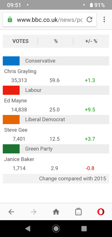 Zippy unlikely scenario of labour beating conservatives, those that don't go the tory route usually go for the indie's (i'm down road form grayling as well), i'd be one of them and they just back the tories anyway. Are we not all hoping that Grayling steps aside after all the balls up that have been made? Though, no idea who would step in..?