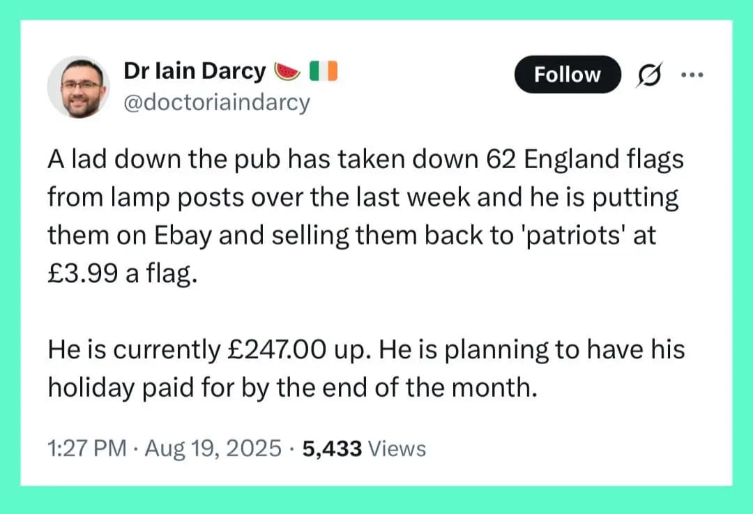 It needs to be called out on social media and in real life or they will move the Overton window so far right we won’t even notice when people are bounded out of their homes. It’s already started in Ireland, north and south and the Faragistes want that to happen in England.
