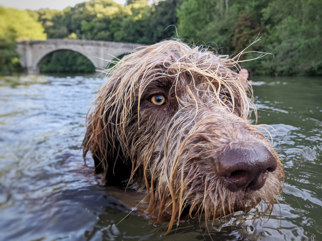Beautiful time swimming in the river Teme in Ludlow. He was so overexcited at us all in the water that he tried to drown us!