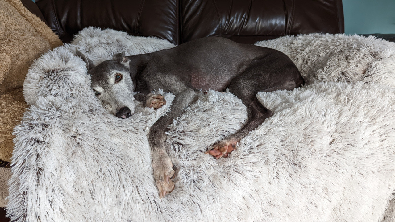 Blue whippet and Saluki x Greyhound. The boy is 13, she is 2yr old.