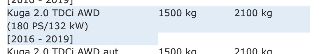 Check the actual car you look at as well. Some may or may not be homologated to tow at all if the wrong options were ticked at the factory. Don't just trust a database that says "Ford Kuga 2.0 TDCI - 2500kg", check on the VIN that the Kuga in front of you is actually type approved for that. And it's not always sensible either. The utilitarian version might be homologated, but the sporty one not, despite being exactly the same just with more power, which should make it even better.