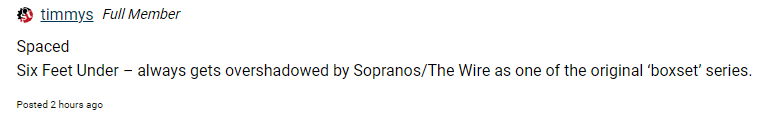 Six Feet Under - always gets overshadowed by Sopranos/The Wire as one of the original 'boxset' series.
