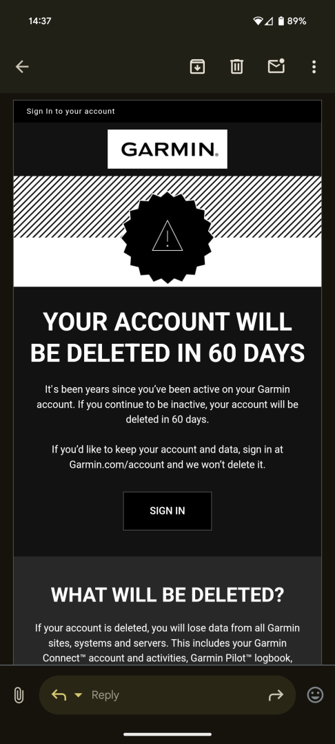 Has anyone received this email (screenshot attached) from Garmin recently?