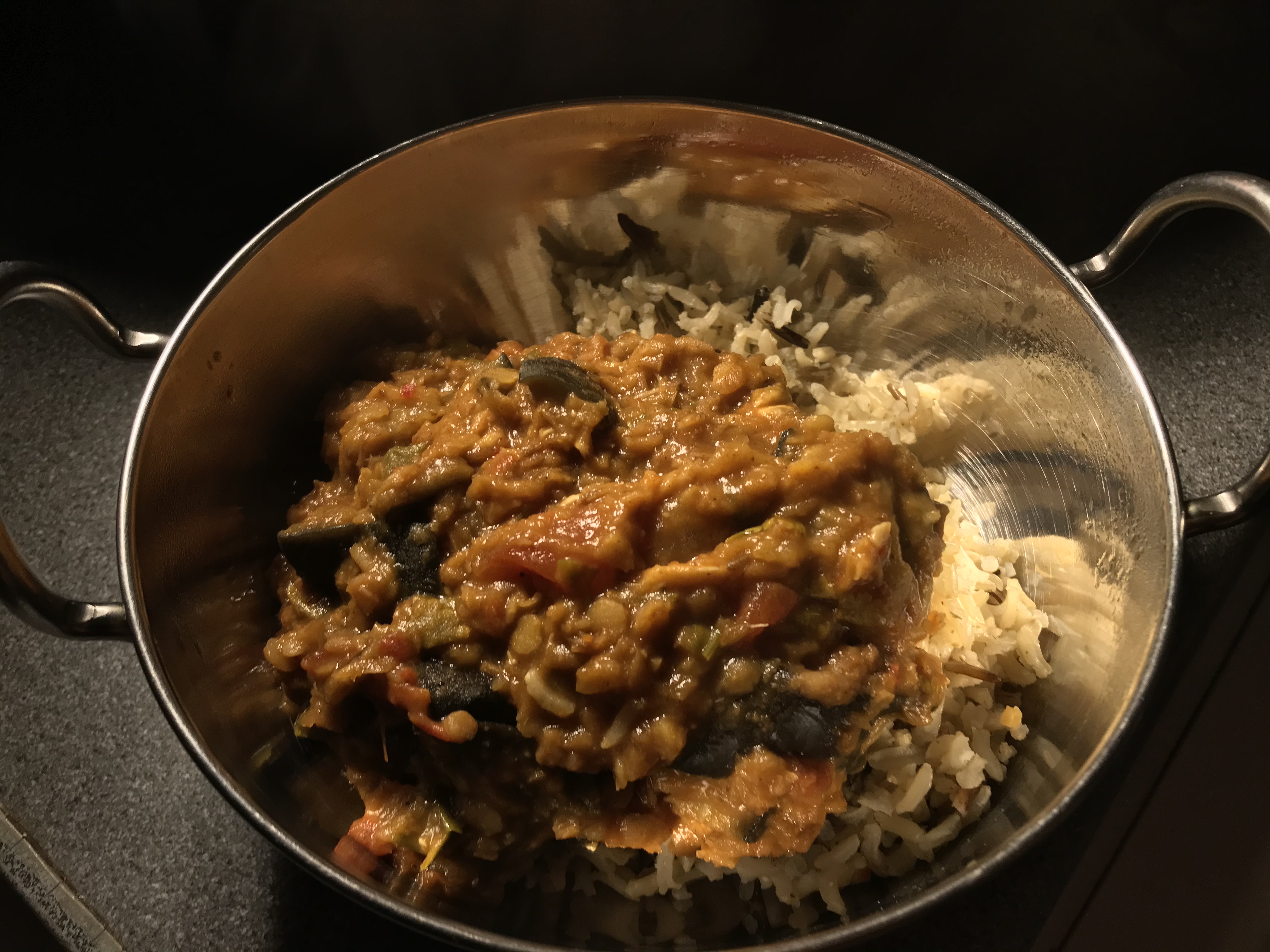 Just licked clean a bowl of this aubergine and red lentil dahl, and it’s 1. Economical 2. Addictively delicious and 3. Has great colour and texture, 4. Easy to make and 5. Nutritious.