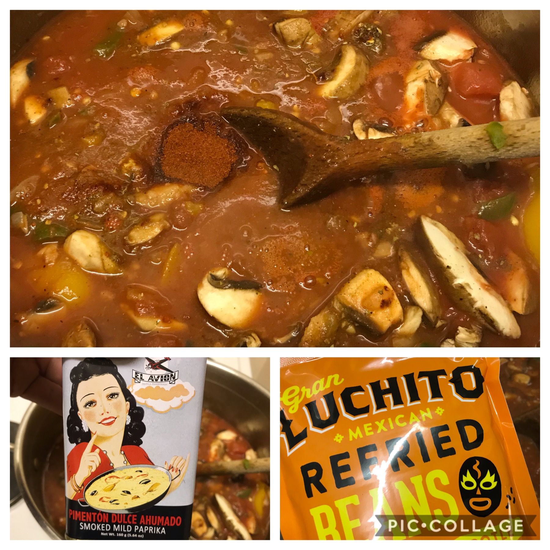 Went with chef John’s tried and tested. This time in addition to the bulgur, refried beans and kidney beans I also added extra garlic, chopped mushrooms, butter beans, tblspn of cocoa powder and just a few teaspoons of molasses. By the cojones of Quetzalcoatl it tastes and smells amazing. ... I need creme fraiche and corn chips and forgot to get 😫