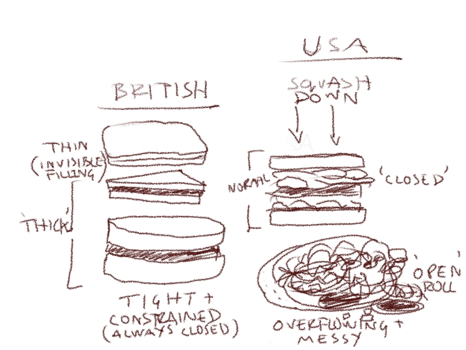 It occurred to me since marrying someone from the US that the British sandwich more often featured/features the bread as the main feature and the fillings are conservative in choice, variety and volume.