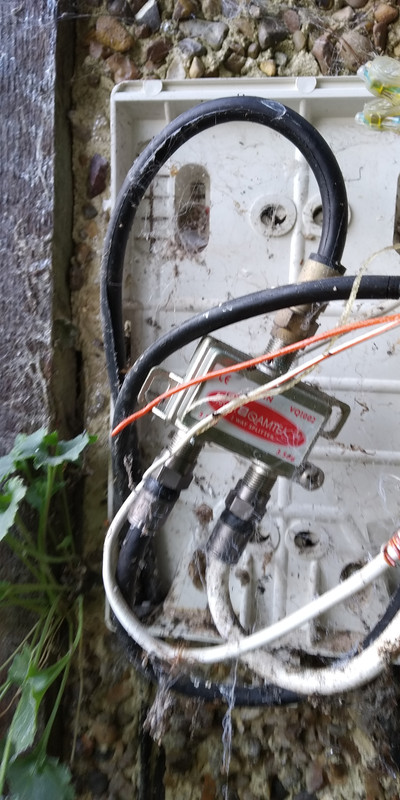 Cable arrives at house where it is split black upstairs for internet and white for telly.