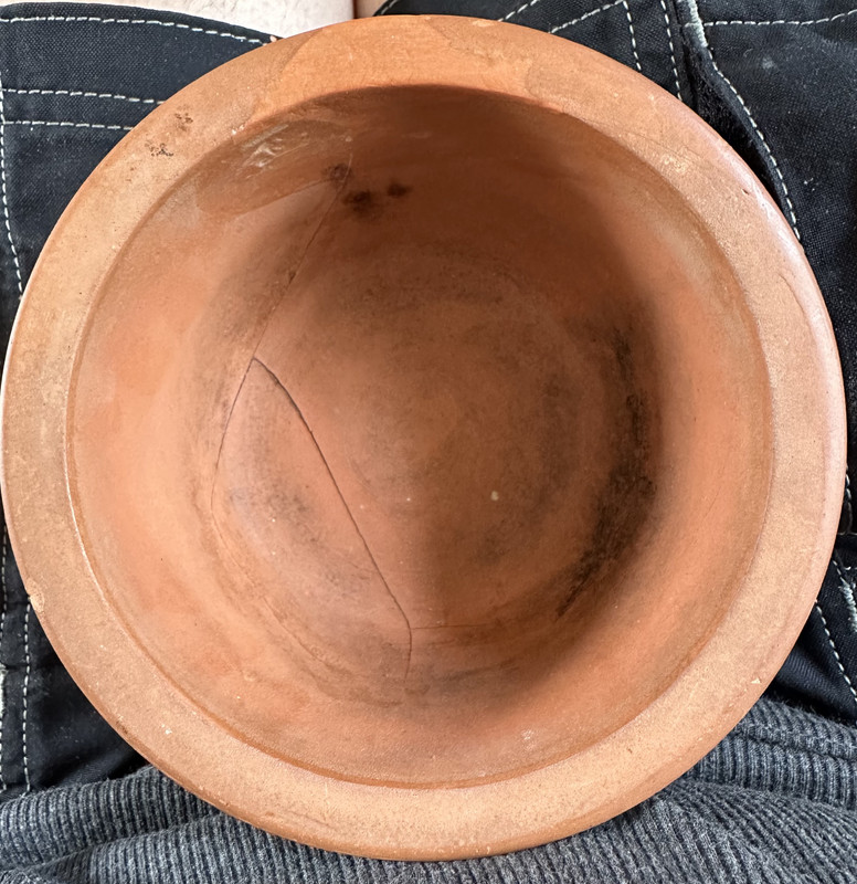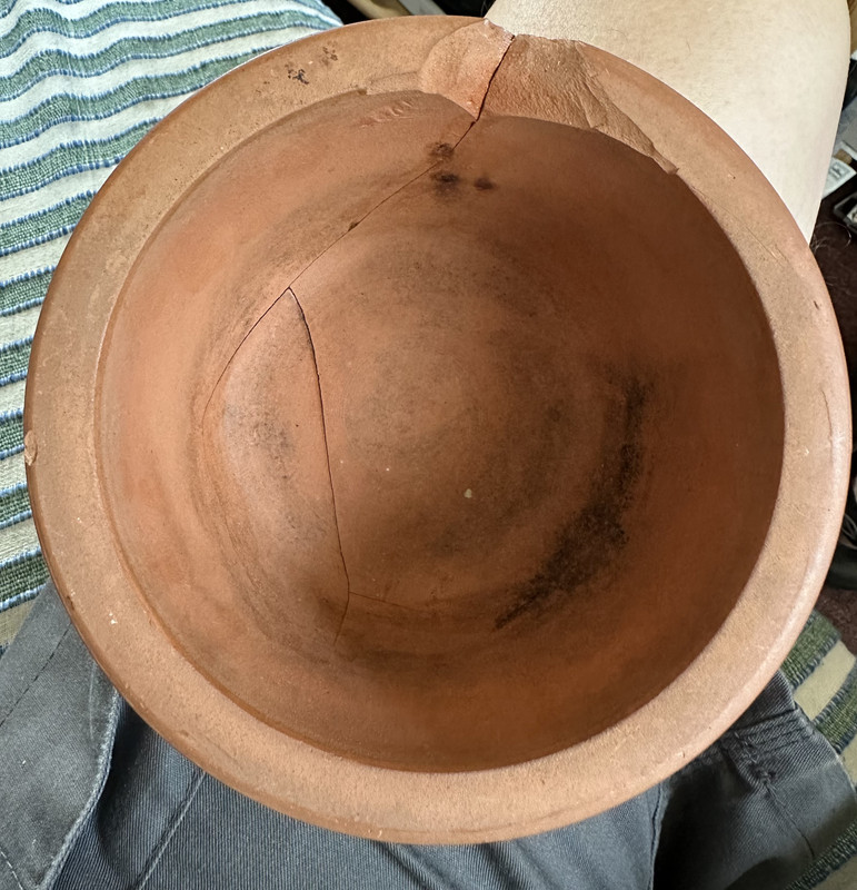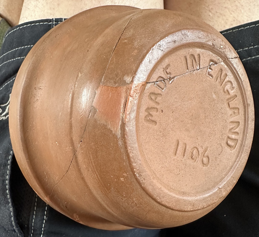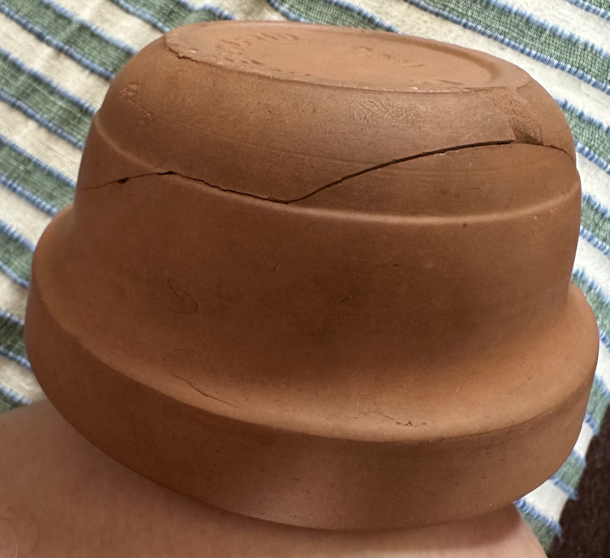 Most recent thing was a terracotta pot that has a lot of sentimental value. Originally bought by my mum, God knows how long ago, it doesn’t have a drainage hole so probably for a succulent. Anyway, it had been put outside and Jo my partner had ‘adopted’ it as something to stub her fagends out on and drop them into. At some point, it had been kicked or knocked over and cracked in a number of places, but amazingly stayed intact. I nearly smashed it to use the pieces in the bottom of other pots, but as it had survived years outside and maltreatment, and it had the marks left where Joey had stubbed her cigs out, I couldn’t bear to part with it, and it’s a very pleasing shape. Trouble was, trying to figure out how to stick the cracks in such a way to stabilise it without actually breaking it to glue it. Then I had an idea, I watered down some PVA glue, and sucked some up into a syringe with a long, large-bore needle, and carefully let the glue soak into the cracks, letting it draw along them and allowing it to set, then adding some more. It worked really well.