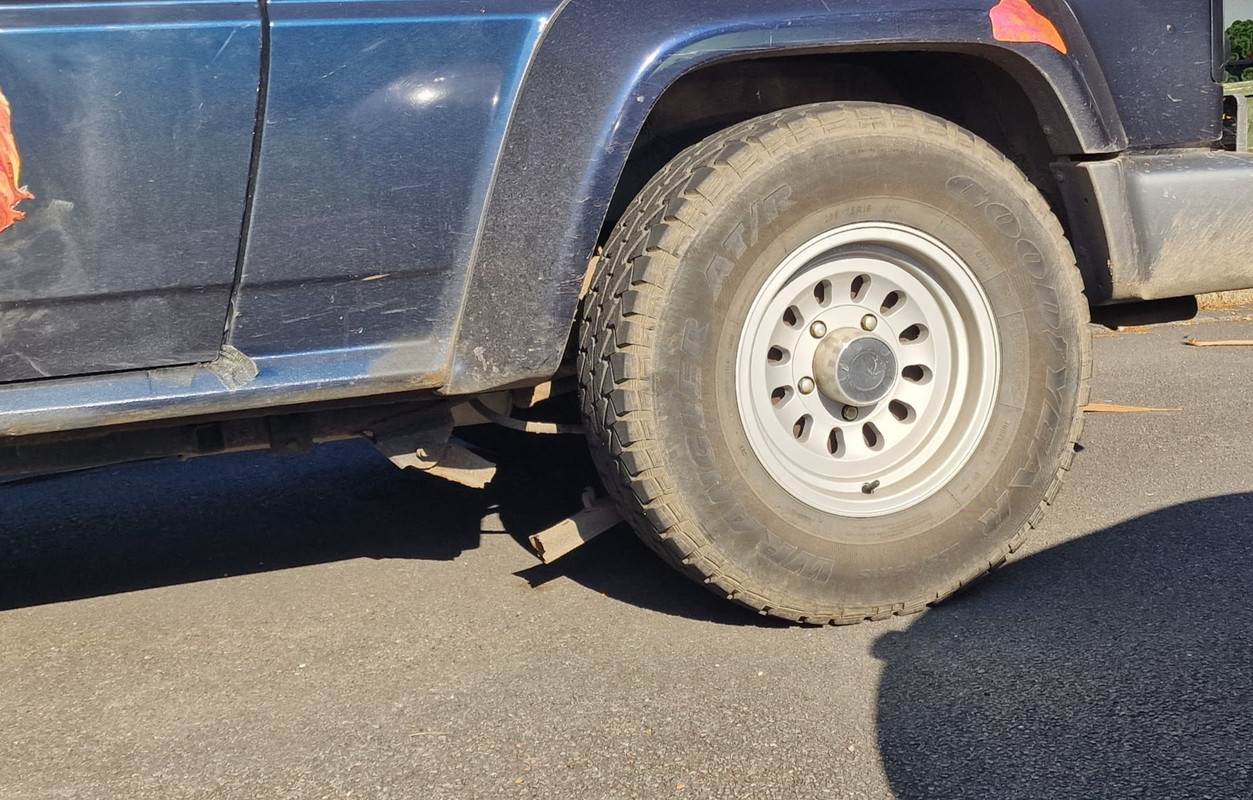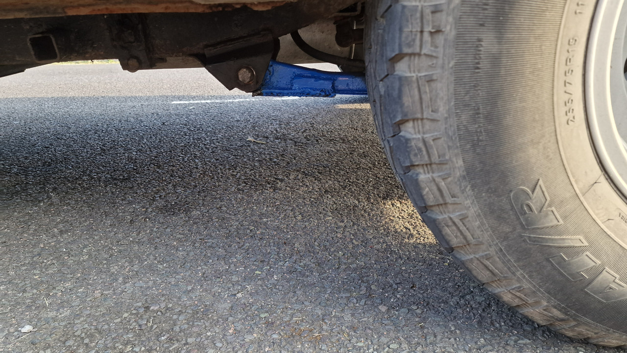 I heard a bit of a clunk under the truck a few drives back so parked it on the drive. It didn't take long to spot the issue. Clue - look just in front of the rear wheel.