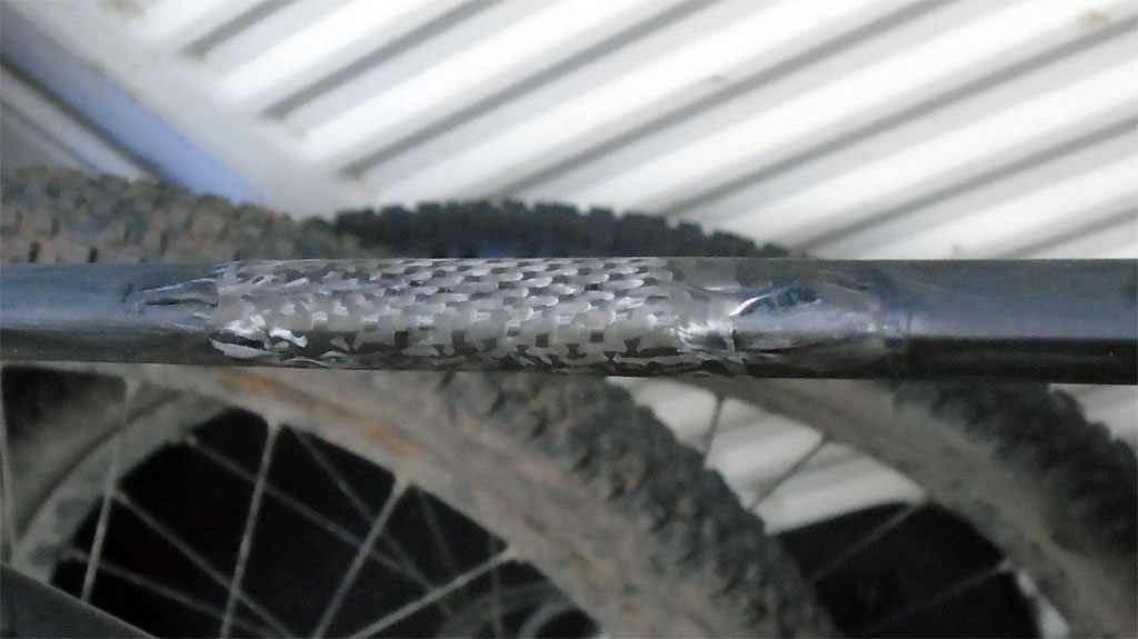 carbon chainstay on the wife's road bike, it been dropped on something and cracked quite nastily but not all the way though. So sanded it back "resined" in a carbon wrap seems to have done the trick and very solid. Not pretty but still to paint it.