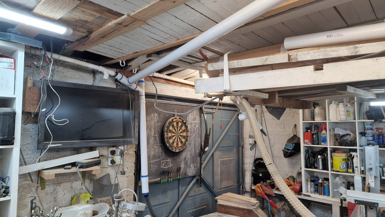 I upgraded the 40mm pipe to larger waste water pipes for the section leading to the main work bench but left the 40mm in place for the other extensions for dust collection elsewhere in the garage which don't get the wood shavings.