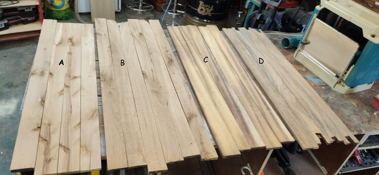 I have cut 6 of those wood posts into planks with the idea of using them for a coffee table as per the other thread. I am thinking that I will need at least two different woods to make the table big enough for the new request so need to know what these woods are. 2 of the bits appear to be the same so there are only 4 different woods to identify.