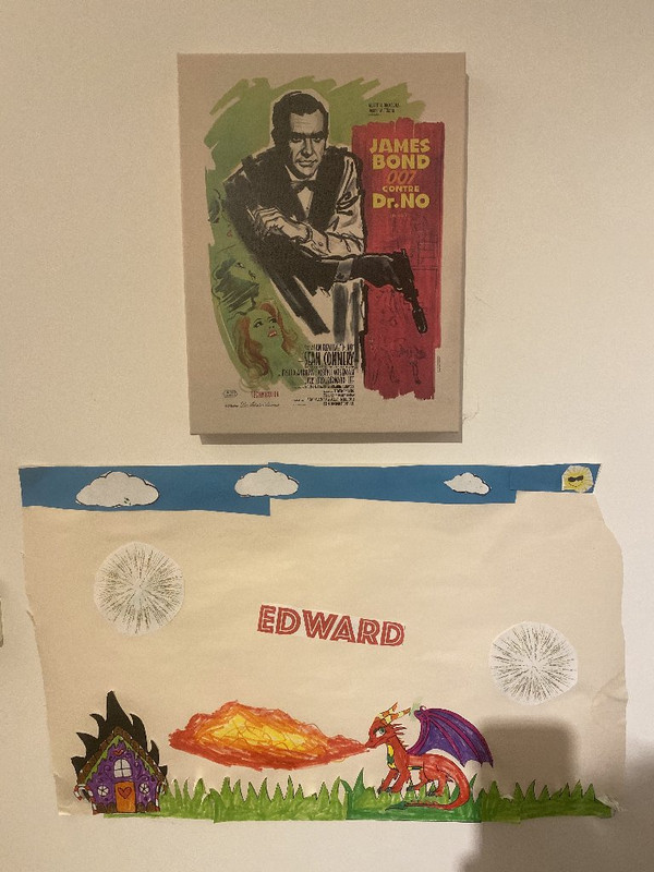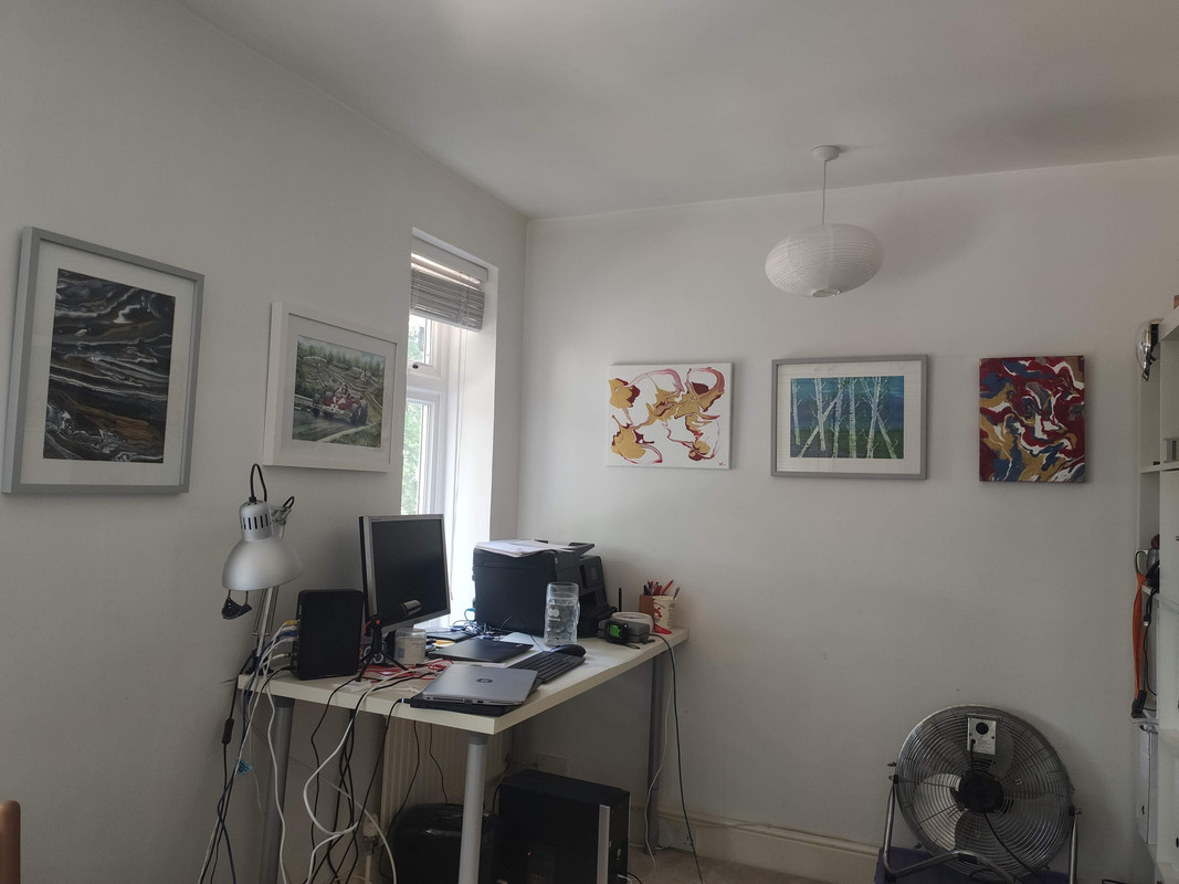 On the walls the racing car is by a friend while the rest are mine. If hang them up for a while so I can decide if I like them or not. If they are deemed okay they can either be sold or moved elsewhere to make way for the next batch.