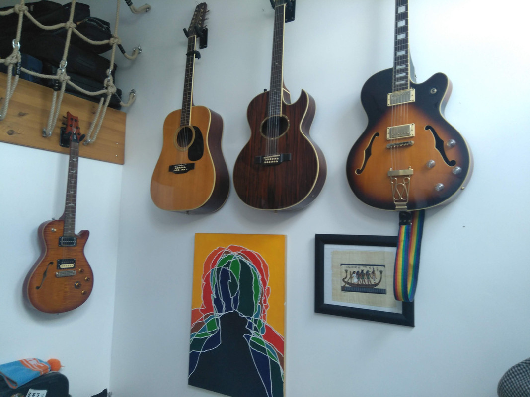 Coldwar Steve, a photo of my mate on the 'Death Road' in Boliva (proper scary) & Johnny F Marr. Plus the obligatory guitars, dart board, out of date STW calendar etc.