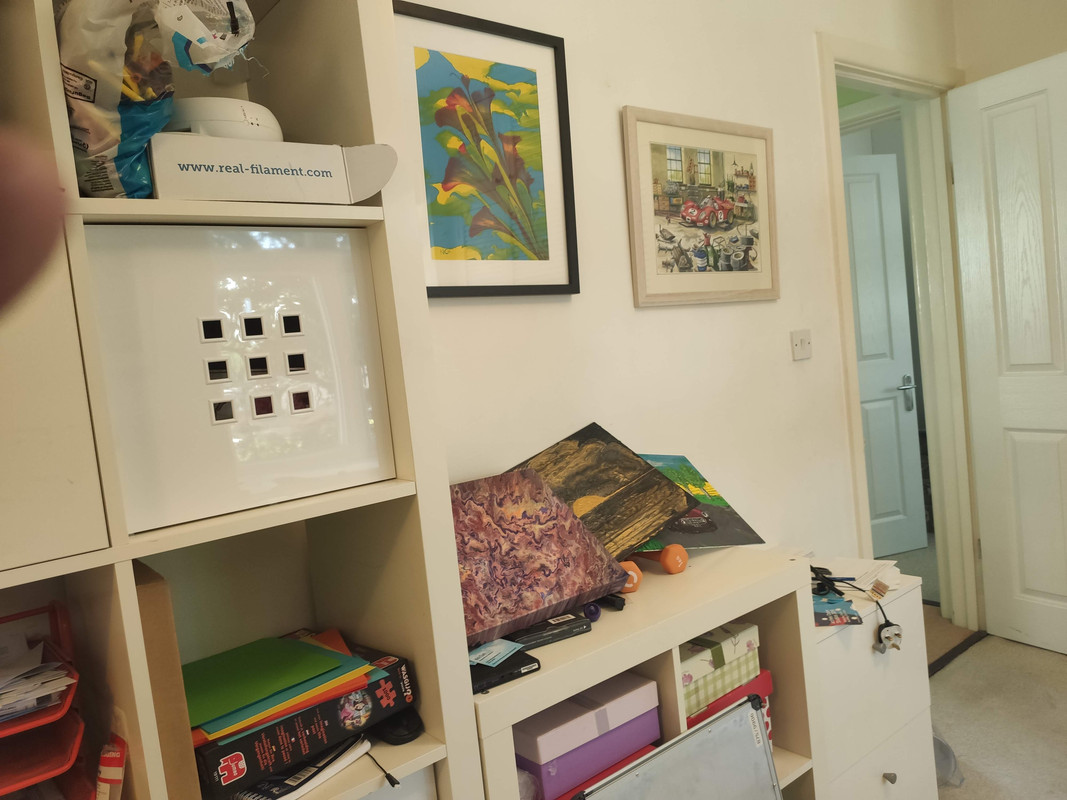 Behind is a car in a garage by the same friend and some more of mine. The pop-art flowers and sky has stayed quite a while and in probably a keeper/sale item. The loose ones on the side probably not although I am undecided with the box framed 'electric sky' one on top of the pile.