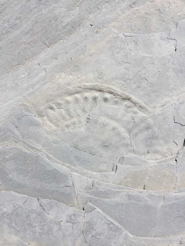 🙂 thanks for the replies. I'm also leaning towards it being just coincidentally worn through the layers in that shape. But others will not be convinced and it remains a dinosaur footprint.