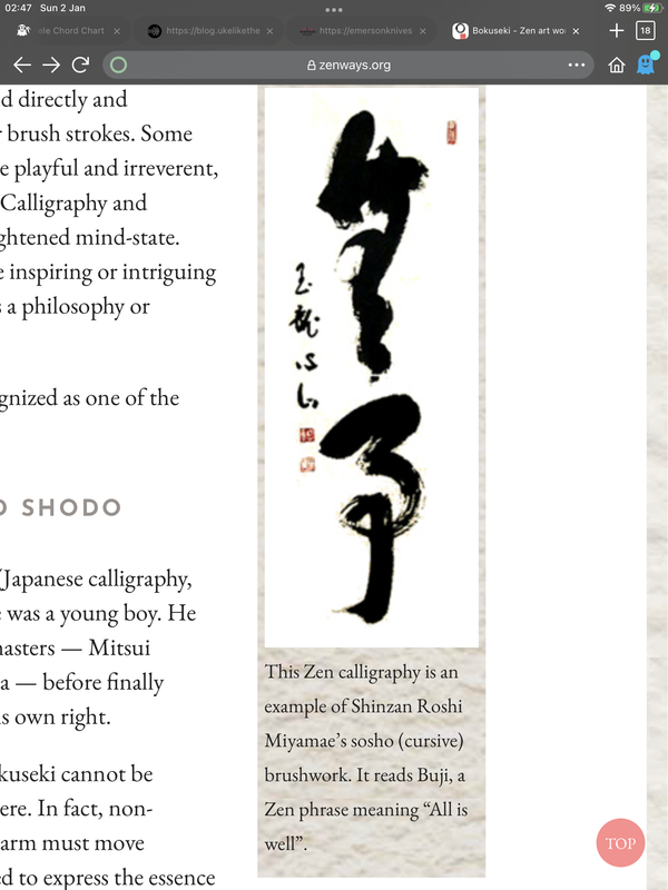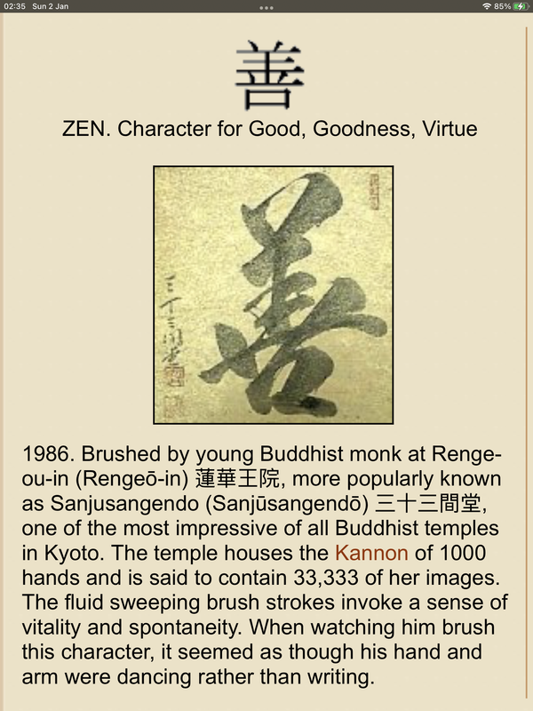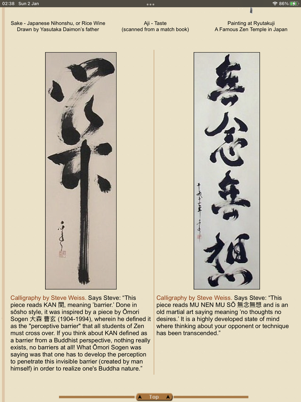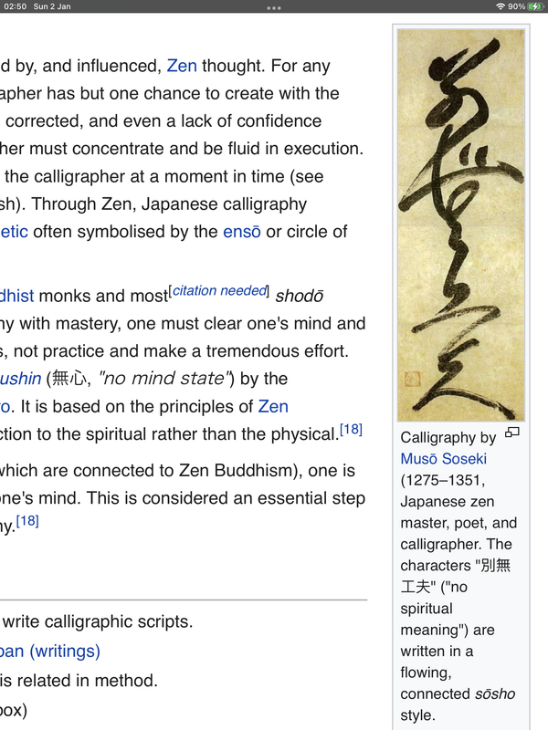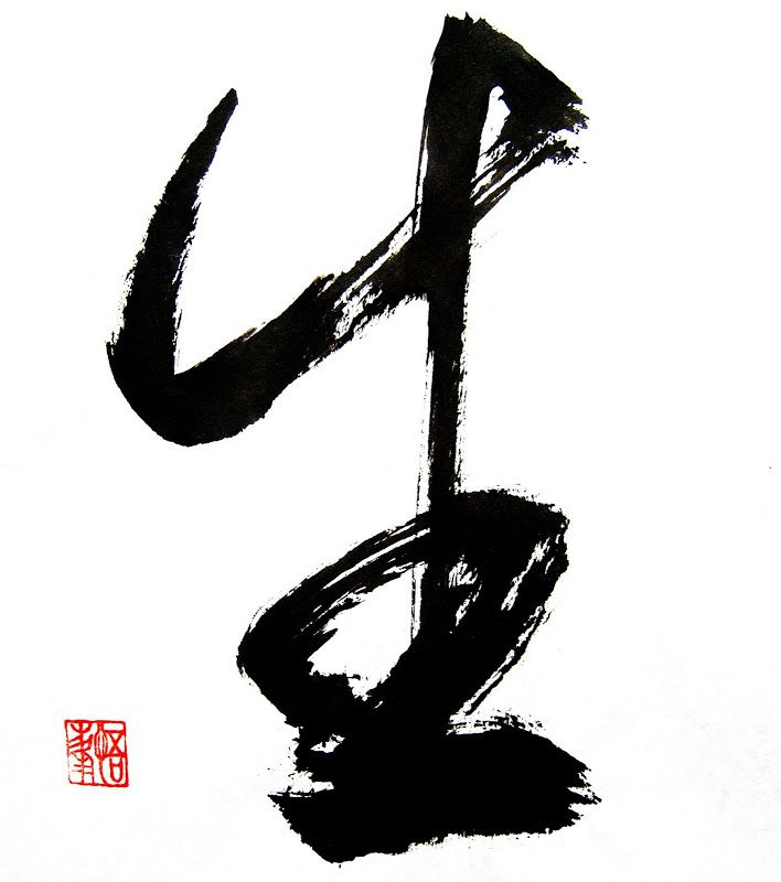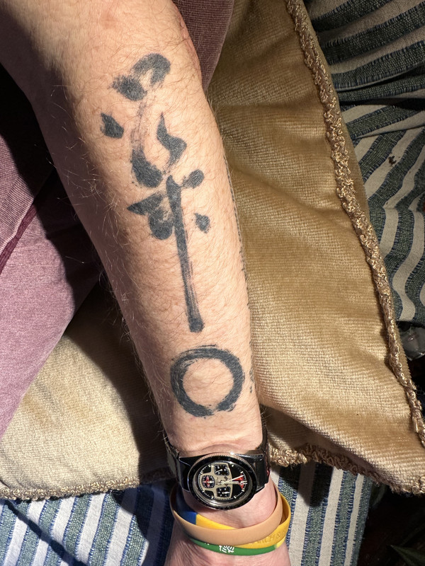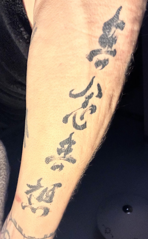 They’re all in sōsho style calligraphy, the top character is Kan, meaning ‘barrier’, below it is a Zen brush circle, and the bottom one is also sōsho style, it’s an old martial arts saying; Mu Nen Mu Sō - no thoughts, no desires. The original calligraphy was by an American, Steve Weiss, who’s studied Zen Buddhism and calligraphy for a long time. It took me quite a long time searching the interwebz trying to find good examples of that style of calligraphy, I knew it as ‘grass’, or ‘running’ style, I didn’t know the term sōsho. I have one or two similar examples, I’ll put them into Photo bucket, along with the original source of my tattoos.