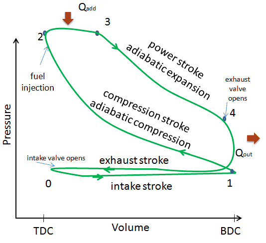 Diesel engines use a completely different combustion process. They have a very high compression ratio and direct injection. The air charge is compressed so that it's hot enough that the fuel burns as soon as it's injected. They vary power by altering the amount of fuel injected, so the fuel-air ratio is much more variable than the fairly stable mixture in petrol engines. If you look at tractor pull competitions, they crank out incredible power from turbo/supercharged diesels by just turning up the boost and injecting massive amounts of fuel. Those things send a plume of black smoke up, the combustion efficiency doesn't matter, it's just a matter of pushing in as much air and fuel as the engine can withstand.