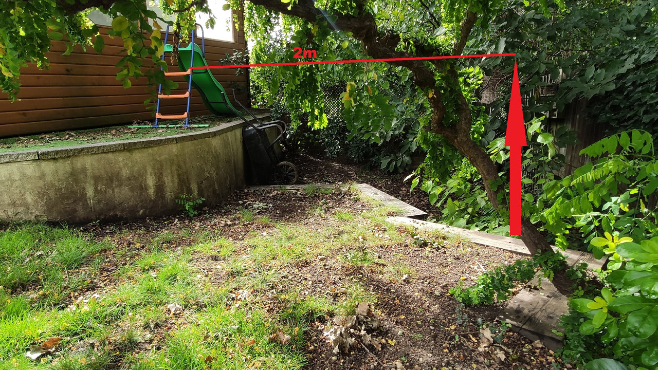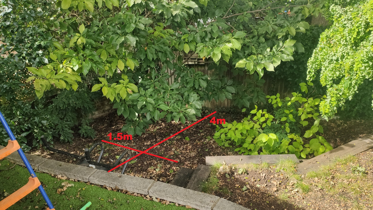 This is the area I am thinking of using and all the trees you see are within our fences. The 1.5m is restrticted by the magnolia growing in the corner. This will obviously require some pruning.
