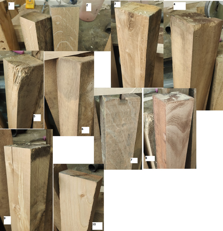 Looking on a phone isn't ideal but I'd say (from L-R) Oak, Oak, Oak, Sapele (Meranti maybe?), Oak, Iroko, Sapele, Sapele, Generic Softwood, Generic Softwood. Look like some reused kickers. Closeups would help though.
