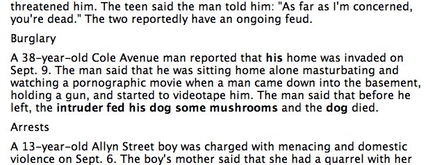 In a selfless quest for the truth, I sacrificed $2.95 to buy the 3000-word "Crime Watch" section from the September 21, 2003 edition of the Akron Beacon. Yes, the article really did appear in the paper.