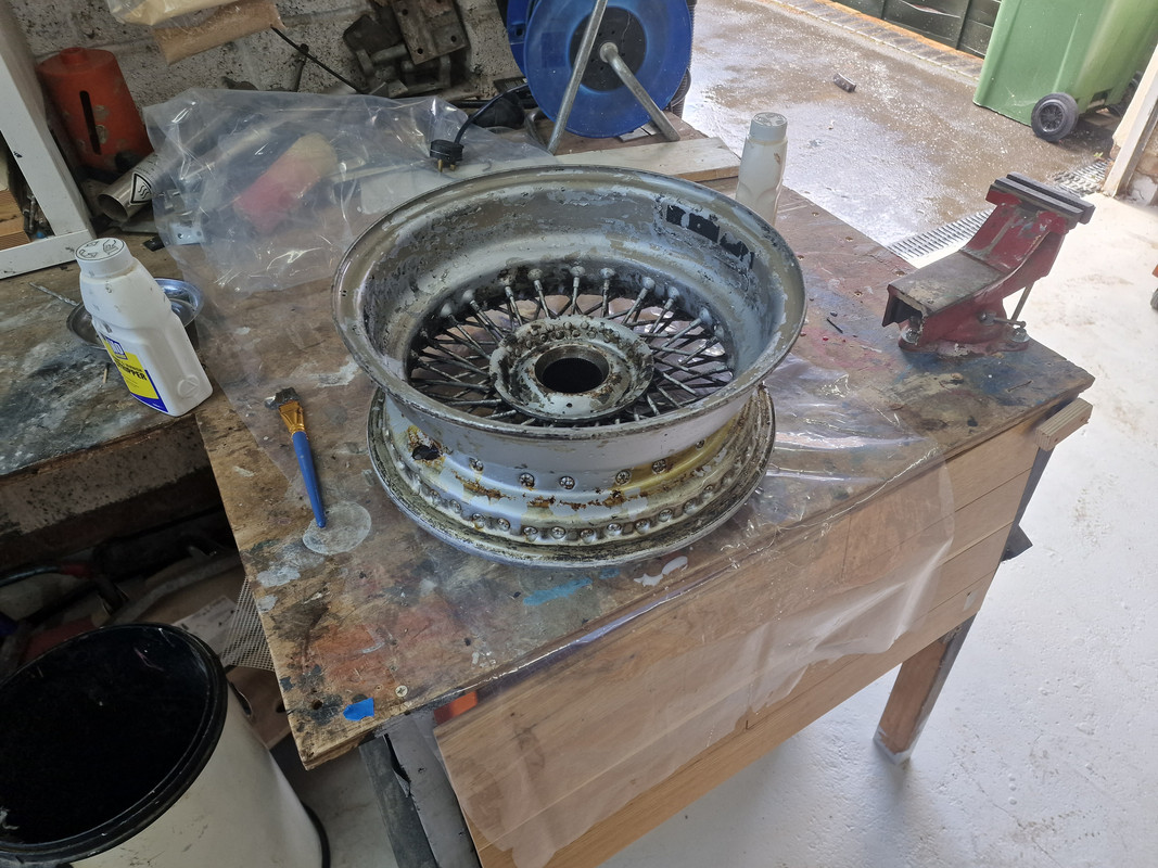 The wire wheel will form the base and is 1 of 7 I bought on eBay for my car, where the seller didn’t know what he was doing. He posted them as “7 Austin Martinwheels” with no picture and meant to have a minimum of £80 each. I turn up with £80 and get 7 Aston Martin wheels for £80 total but this one is unsafe to use on the car.