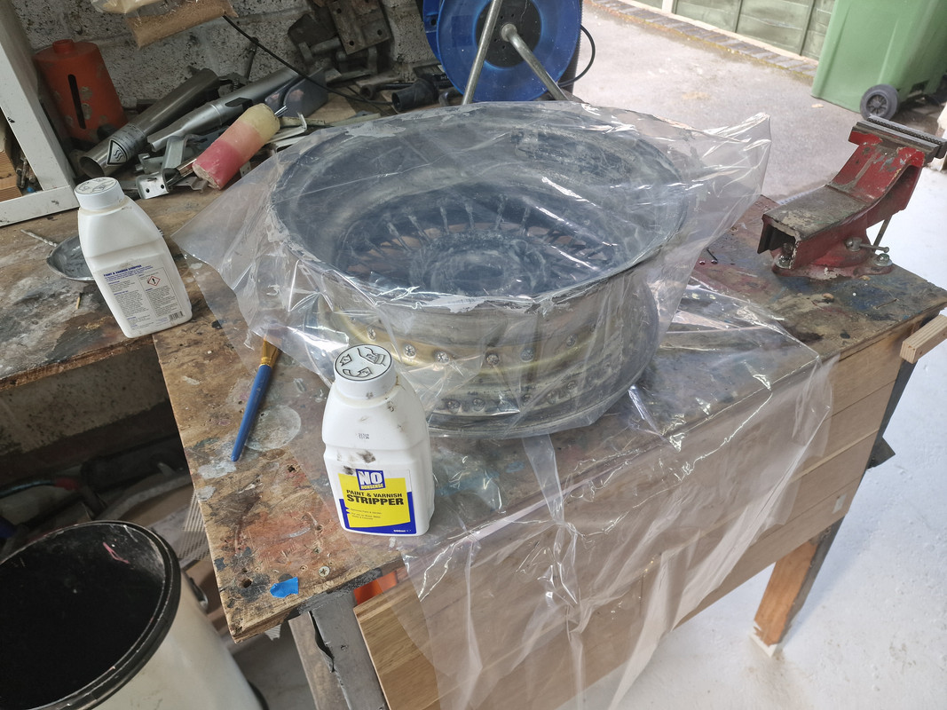 Well this is the wheel after 4hours of soaking in stripper and then being blasted with a pressure washer. I will give it another go with the stripper and washer and then just spray over the whole thing with a chrome rattle can regardless I think. I can't paint it until I have cut the legs and welded them on though.