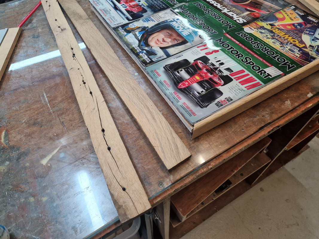 I used the tablesaw to turn an old oak fence post into four (3 shown) planks to act as edges for the table. These will cover the magazine edges and the edges of the ply based. The ply base is 18mm hardwood ply leftover from making the workbench you cannot see to the left of, and behind, the camera.
