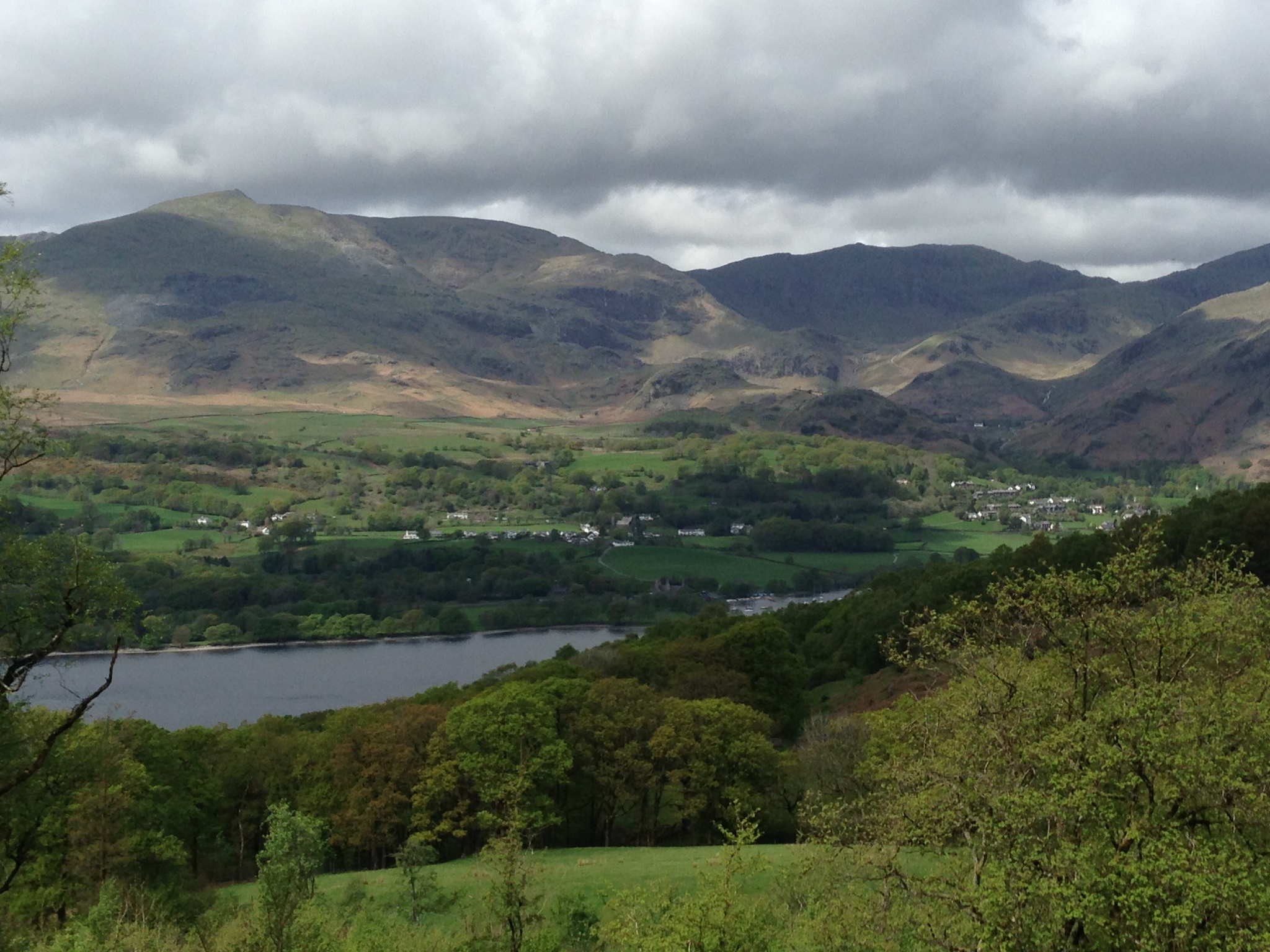 Before reaching the wood, I came down a wet grassy bank. It was too slippery to run and too steep to ride, so I slid down the bank on my heels with the bike beside me, using the brakes to slow me down. Great fun. The steep path through the trees opened out and the gradient became less severe, leading to a pleasant blast down through a deserted forest. The wind had abated by this stage, and the rain also seemed to have eased off a little too, although this was probably because I had almost dropped to sea level. Arriving at a clearing, most of Thirlmere lay below me. I heard the muted sound of rotor blades, which had me looking round for a yellow rescue helicopter. I didn’t see one, but instead saw the black outline of an Army Apache attack helicopter below me, traveling low to the water, down the lake in the direction of Grasmere.
