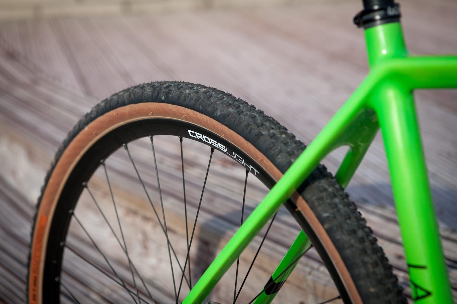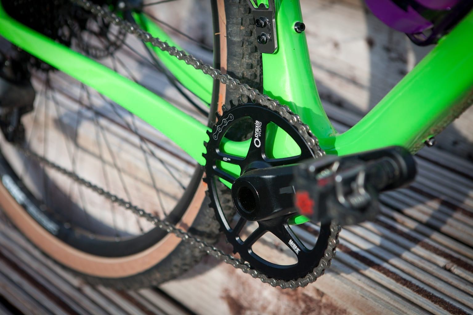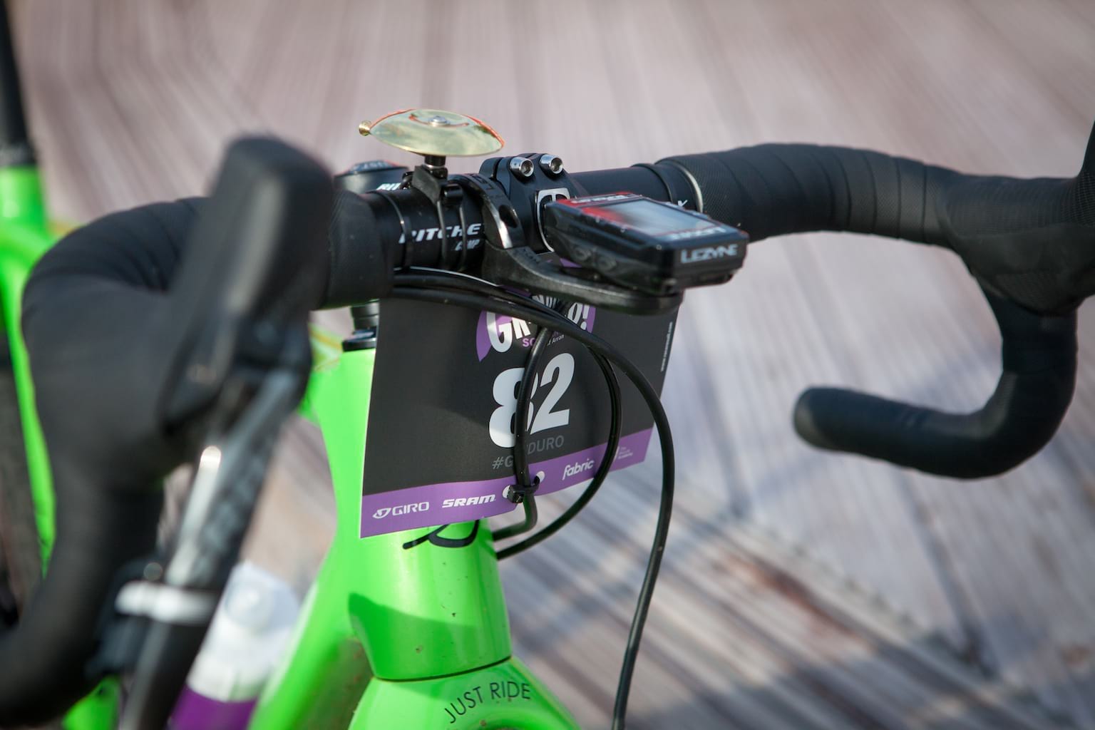 This bike came showcasing some of Upgrade’s other brands wares. We therefore had Praxis cranks, Kinesis Crosslight Disc wheels, Ritchey finishing kit and Lezyne accessories hanging off the luscious green machine. It seemed only right to fit a Fabric “Grinduro” branded Scoop saddle.