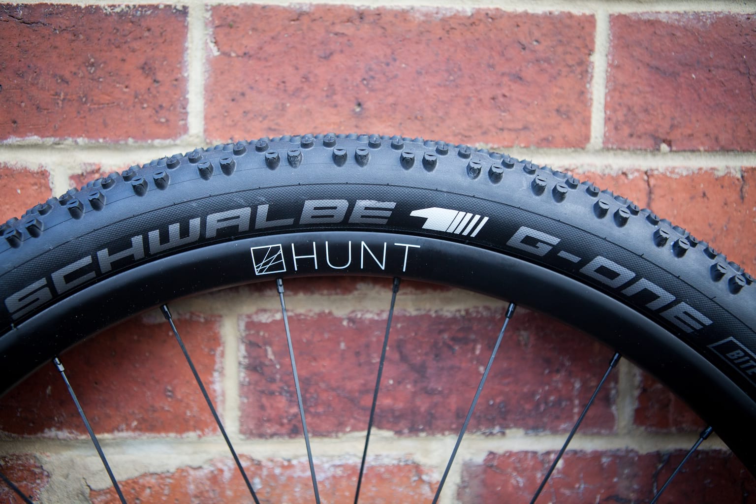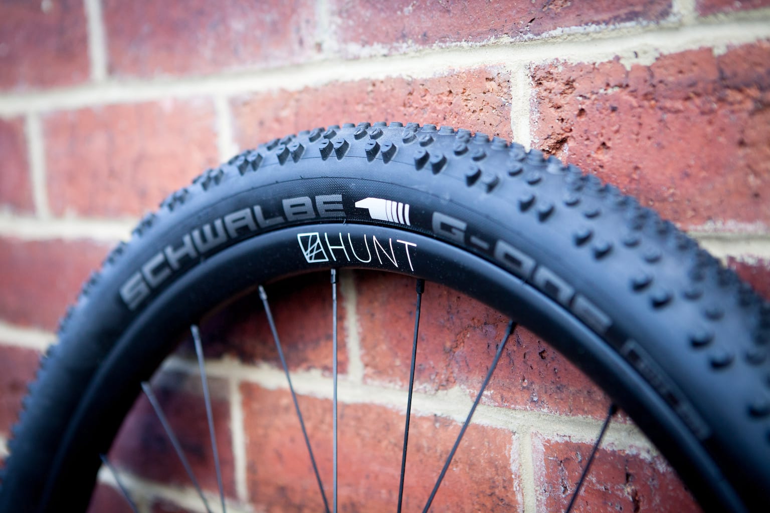 Hunt has a few tyre options available, but we chose the Schwalbe G-One Bites in a 2.1in flavour. We rode the 700c version of the tyre at the Canyon Grail launch earlier in the year and were impressed, so look forward to trying out the larger volume, smaller diameter version. One thing we’ve already noticed is the side-knobs add a bit more width to the tyre than the 2.1in WTB Nanos that they replace. Luckily there’s plenty of room in the Bombtrack Hook EXT to accommodate the extra rubber, and we think we’ll appreciate them as this summer’s dust is quickly being dampened down by the August bank holiday weather.