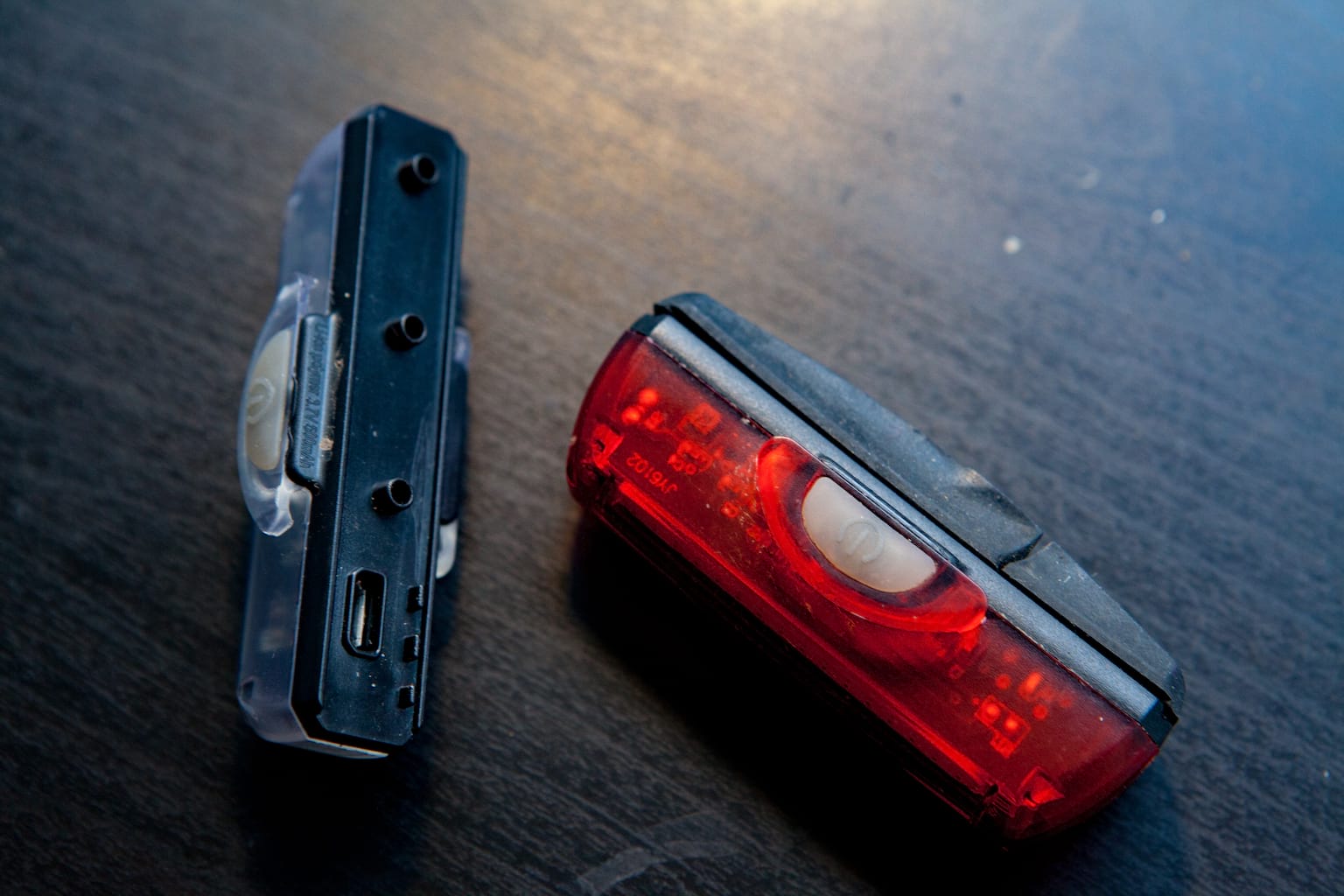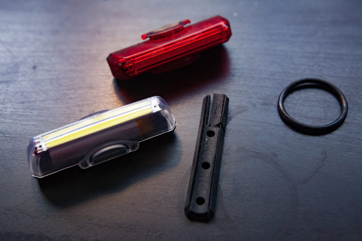 They have a long battery life – varying from 12 to 2 hours in constant mode and 45 to 5 hours in flash mode. Each light is around the size of a AA battery (although power comes from an external battery, charged via included micro USB). The lights fit using a simple o-ring elastic band. As the names suggest, the max output of the front light is 100 lumens and the rear is 50 lumens.