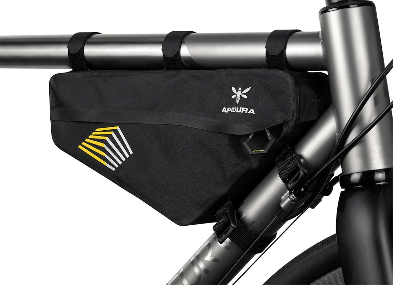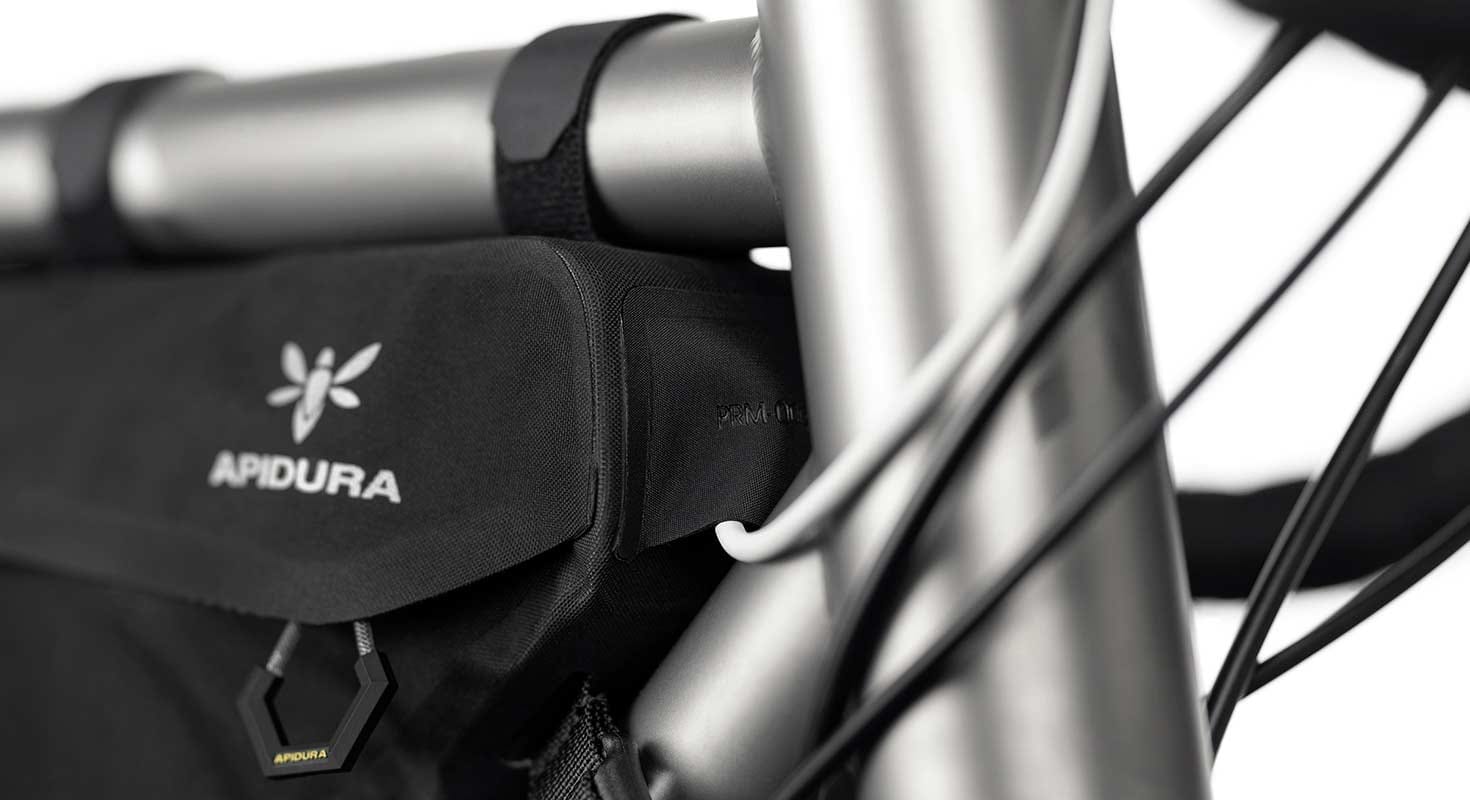 Each of the three packs (a bar bag, frame bag and saddle bag) is constructed from “Hexalon”, which is a bespoke laminated fabric developed specifically for Apidura. The company says that after testing 15 different commercially available materials with riders and ambassadors, none were met its design brief based on the demands of ultra-distance competition. The new material designed and developed by Apidura is waterproof and lightweight, with strong tear and abrasion resistance.